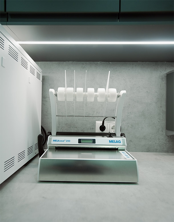 Sterilizācija nodrošināta pēc Vācijas standartiem no MELAG ražotāja: termo dezinfektors, ķirurģiskais autoklāvs un autoklāvs uzgaļiem.